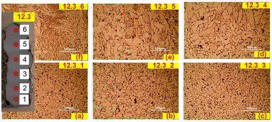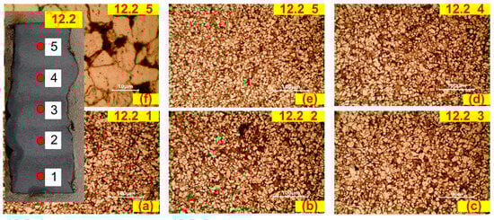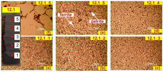 To validate the predictions of the thermal model, metallographic analysis was performed on samples extracted from three different zones of the WAAM-fabricated test specimens: sample 12.1 (area 1), sample 12.2 (area 2), and sample 12.3 (area 3). Figure 5, Figure 6 and Figure 7 present representative micrographs obtained from these analyses. In all three samples, 12.1, 12.2, and 12.3, point 1 is always closest to the substrate. Figure 5a–f illustrates the microstructure at points 1 to 5 along the vertical axis of sample 12.1. In all examined locations, a ferrite–pearlite microstructure was observed. The ferrite grain size in this region does not exceed 30–40 µm, and the pearlite content is low. Figure 6a–f shows the microstructure of sample 12.2, located around layer 21, the mid-height of the specimen. As predicted by the thermal model, a ferrite–pearlite structure is again observed. However, the ferrite grains here are noticeably smaller compared to those in sample 12.1, with an average size rarely exceeding 25 µm []. Numerous ferrite grains exhibit twinning, and the pearlite—mainly in lamellar form—is located along ferrite grain boundaries. The microstructure of the uppermost layers of sample 12.3 is presented in Figure 7a–f. At points 1, 2, and 3, which have undergone at least three cycles of reheating and cooling, the structure remains ferrite–pearlite but features alternating regions of finer and coarser ferrite grains. This grain size variation is attributed to differences in cooling rates and the repeated thermal cycling above the recrystallization temperature and even beyond the AC3 transformation point. From point 4 upward, individual grains of Widmanstätten ferrite begin to appear (Figure 7d), becoming dominant by point 6, where a pronounced Widmanstätten structure is observed (Figure 7f). The presence of such a structure is indicative of overheating during the WAAM process and confirms the localized thermal accumulation in the uppermost layers.