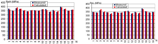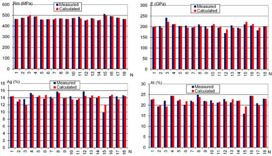 Comparison of the measured and calculated values for the upper yield strength ReH, lower yield strength ReL, tensile strength Rm, Young’s modulus E, uniform elongation Ag, and elongation at fracture At.