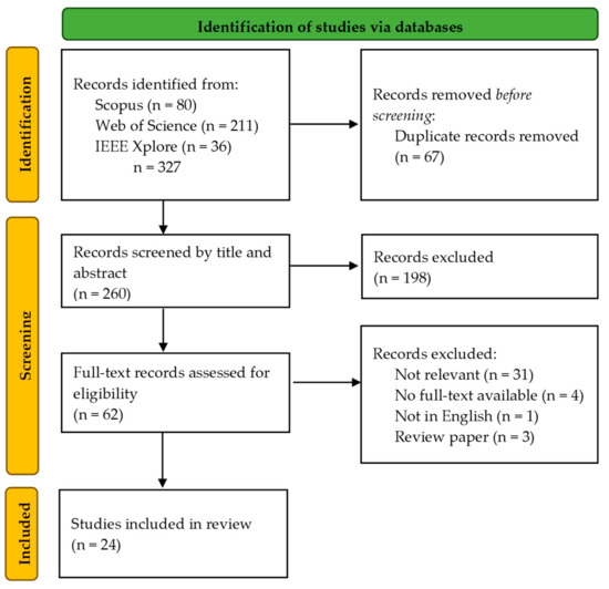 This literature search was conducted on 26 August 2024, utilizing three leading electronic databases: Scopus, Web of Science, and IEEE Xplore, chosen for their extensive coverage of scientific and technical literature. To cast a wide net while ensuring precision, this search employed a combination of keywords and Boolean operators: