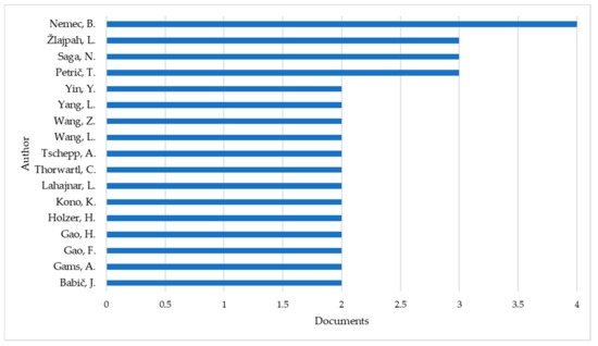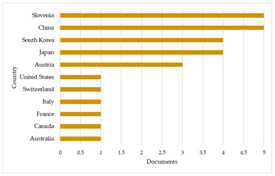The documents were further categorized based on their country of origin. Figure 3 provides a visual representation of the geographical distribution of the 24 studies included in the systematic review, considering the countries of all authors involved in each study. According to the analysis, Slovenia and China stand out as the leading contributors to research in this area, each accounting for five publications. South Korea and Japan follow closely with four publications each, while Austria contributes three publications. This geographical breakdown highlights the countries most actively engaged in advancing research on robotics in skiing.