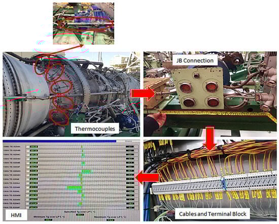 The experimental setup involved the installation of sixteen K-type thermocouples, which were distributed at strategic positions along the turbine’s exhaust system. These sensors were responsible for continuously measuring the EGT and transmitting the data through a Junction Box (JB) and connecting terminals to a Human–Machine Interface (HMI) located in the turbine control room. The HMI system displayed and logged the temperature readings at one-second intervals, which allowed for the continuous observation of thermal patterns across the turbine’s hot section. The specifications of the thermocouples are described in Table 2. The measurement and transmission process are illustrated in Figure 2.