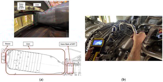 Borescope inspection zones in the gas turbine hot section: (a) liner region selected for visual inspection; (b) stator blades of HPT selected for condition assessment [43].