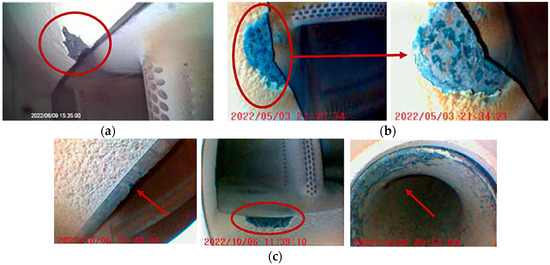 The borescope system used was equipped with a compact, high-resolution camera mounted on a flexible probe. The device was inserted into the hot section through an access port after burner disassembly. A bright LED light at the tip of the probe enabled clear visual feedback for capturing detailed images and videos of the internal surfaces. As shown in Figure 4, the inspection results revealed a progressive increase in coating damage on the stator blades and liners over time. Figure 4a corresponds to the 2000 h inspection, where minor coating wear was observed. Figure 4b shows the 4000 h findings which indicate more pronounced damage. Finally, Figure 4c illustrates the 6000 h inspection, where the deterioration had expanded across a wider area.