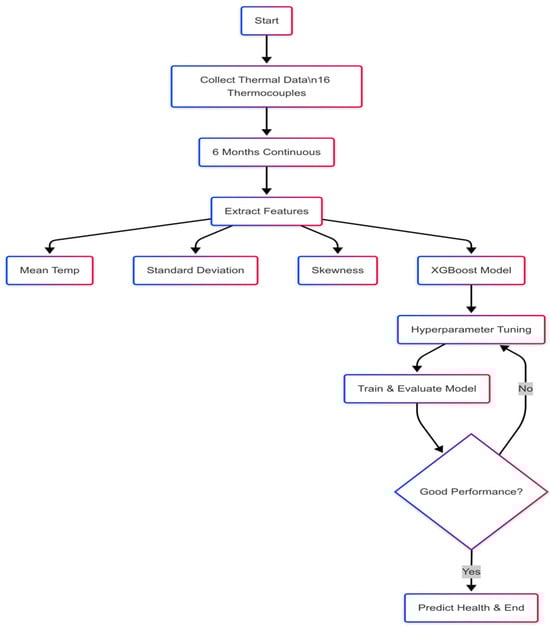 To assess the turbine’s thermal condition, features such as mean temperature, standard deviation, and skewness were extracted from the time-series data collected by the thermocouples. The feature-labeled dataset was further split into training and test subsets and the XGBoost classifier was trained to discriminate between healthy and fault conditions. Precision, recall, F1-score, and classification accuracy were evaluated as the performance measures of the model. To provide a clear picture of the whole process pursued in this work—from the acquisition and feature extraction from the data to classification and analysis—a schematic diagram is shown in Figure 5. The process is optimized for fault detection within turbines using the thermal sensor data, from acquiring the data from the 16 thermocouples for six months to moving on to feature extraction and further on to developing the model using the XGBoost. After hyperparameter tuning and training evaluation, the system tests the performance of the model, and if satisfactory, makes a prediction regarding the health condition of the turbine that closes the loop. The system has intelligent re-tuning enabled by intelligent branching.