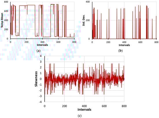 Progressed statistical analysis for each interval: (a) temperature mean value; (b) standard deviation; (c) Skewness.