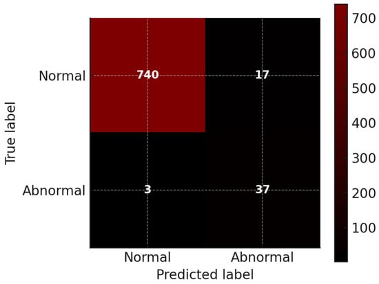 To evaluate the effectiveness of the XGBoost classifier in detecting abnormal thermal conditions in the gas turbine, a series of performance metrics and visualizations were produced. These provide a quantitative and qualitative assessment of the model’s ability to distinguish between healthy and faulty operating intervals. Figure 8 presents the assessment metrics of the XGBoost classification model used for thermal condition monitoring. The model achieved a classification accuracy (CA) of 97.2%, which reflects its excellent overall performance. The F1-score reached 96.8% and indicated a strong balance between precision and recall. Precision, which measures the proportion of correctly identified abnormal intervals out of all the predicted abnormal cases, was 97.5%. Meanwhile, the recall value of 96.1% demonstrated the model’s capability to correctly identify most actual abnormal cases. These values collectively suggest that the XGBoost algorithm provides highly reliable and consistent predictions to minimize both false alarms and missed detections. Figure 9 shows the confusion matrix for the final classification results. Out of 797 intervals, the model correctly identified 740 normal intervals and 37 abnormal intervals and corresponded to the true negatives and true positives, respectively. Only 17 normal intervals were incorrectly classified as abnormal (false positives), and 3 abnormal intervals were misclassified as normal (false negatives). These minimal misclassification counts validate the high precision and recall values and demonstrate the robustness of the model, especially given the class imbalance between the normal (757) and 40 abnormal cases.