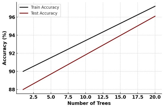 To further evaluate the model’s discriminative ability, Figure 10 displays the Receiver Operating Characteristic (ROC) curve. The curve shows a steep rise toward the top-left corner, indicating a high true positive rate with minimal false positives. The Area Under the Curve (AUC) was found to be 0.97, which confirms the classifier’s strong capacity to differentiate between healthy and faulty states. AUC values close to 1.0 typically represent excellent model performance, and in this context, it reinforces the reliability of the classifier for predictive maintenance applications. Figure 11 illustrates the learning curve, showing how the model’s accuracy evolves as the number of trees in the XGBoost ensemble increases. The training accuracy steadily rises from 90.0% to 97.2%, while the testing accuracy improves from 88.0% to 96.1% as the number of trees increases to 20. The smooth convergence between the training and testing curves indicates that the model generalizes well and is not overfitting. The final configuration, using 100 trees (as previously defined in Table 3), was selected based on this convergence and optimal performance plateau. Collectively, these results validate the reliability and predictive power of the XGBoost model in classifying gas turbine operating conditions based on thermal data. The model successfully integrates statistical feature extraction with advanced ensemble learning to deliver actionable insights for proactive maintenance strategies. A comparative analysis summarized in Table 4 demonstrates that the proposed XGBoost model outperforms traditional machine learning algorithms.