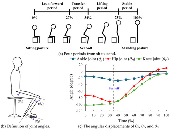 Based on the research conducted by Hirschfeld et al. [1] and Sato et al. [2], the sit-to-stand motion can be divided into four distinct phases: the “Leaning Period”, “Transfer Period”, “Upright Period”, and “Stability Period”, as depicted in Figure 1a. Furthermore, researchers have defined the hip joint angle (θH), knee joint angle (θK), and ankle joint angle (θA), as shown in Figure 1b. The angular displacements of the hip joint (θH), knee joint (θK), and ankle joint (θA) throughout the sit-to-stand process are illustrated in Figure 1c.