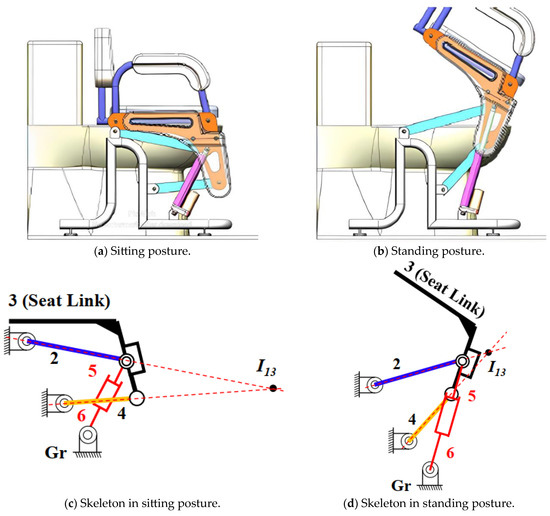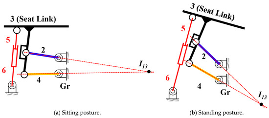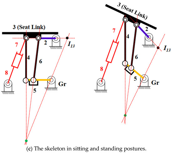 - The actuator directly drives the seat link, which rotates around the center of the knee (instant center I13) as much as possible. Its rotation angle reaches 48°, thus eliminating the need for tiptoeing or the downward movement of the hips.
