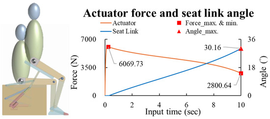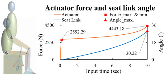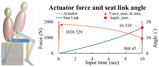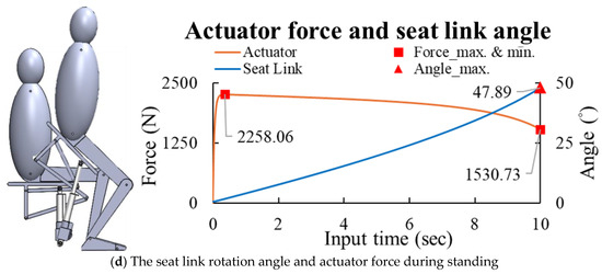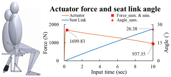 - In this study, the stroke and speed of the actuator are 150 mm and 18 mm/s, and the maximum driving force is 2000 N, as shown in Figure 13. This allows the seat to reach the standing position in approximately 10 s.
