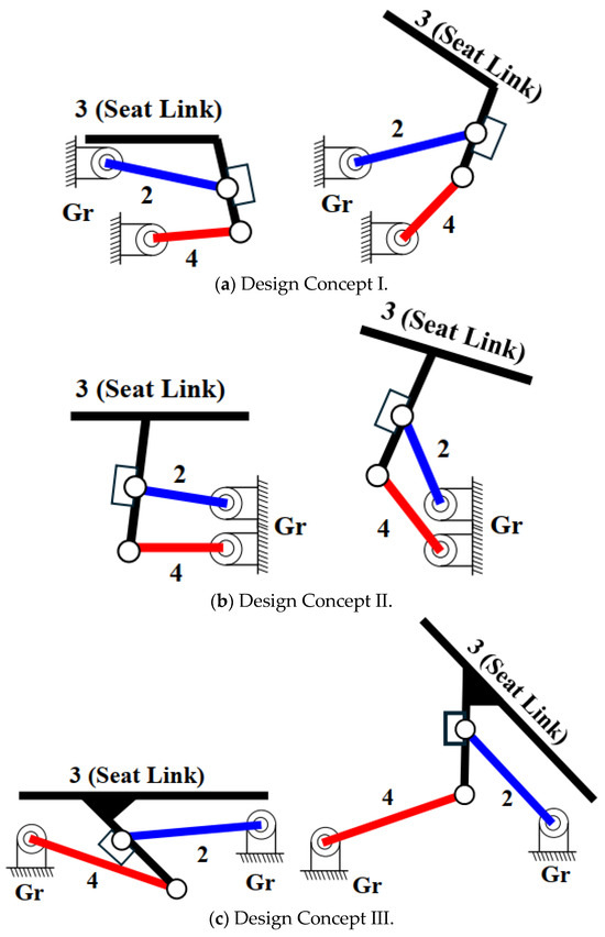 Based on the analysis of existing products and patents related to auxiliary standing toilet chairs, most mechanisms, excluding those utilizing a power cylinder, are based on four-bar linkages. This paper focuses on four-bar linkage-based designs, which can be categorized into three concepts based on the position of the fixed pivots. In Design Concept I (Figure 11a), the pivots are positioned at the rear of the chair. In Design Concept II (Figure 11b), the two fixed pivots are located at the front of the chair. In Design Concept III (Figure 11c), the two fixed pivots are positioned on opposite sides, with one positioned at the rear and the other at the front. The mechanism in Figure 2 belongs to Design Concept II, while the mechanisms in Figure 5 and Figure 7 belong to Design Concept I.