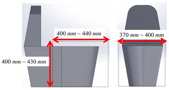 - The dimensions of the auxiliary standing toilet chair must be within a depth of 400 mm–440 mm, a width of 370 mm–400 mm, and a height of 400 mm–430 mm, as shown in Figure 12.