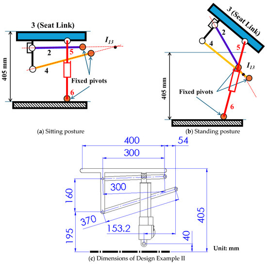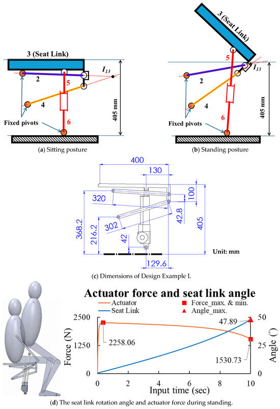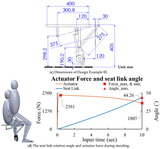 In Design Concept I, Design Example I is proposed for an auxiliary standing toilet chair, as shown in Figure 14. Figure 14a–c show its sitting and standing mechanisms and corresponding dimensions. The analysis using the computer-aided engineering software INSPIRE shows that the seat link (3) achieves a rotation angle of 48°. For a person weighing 150 kg (equivalent to 1500 N), the required actuator force is 2258 N, as shown in Figure 14d. This design has the following characteristics: