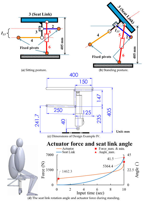 In Design Concept III, Design Example IV is proposed for an auxiliary standing toilet chair, as shown in Figure 17. Figure 17a–c show its sitting and standing mechanisms and corresponding dimensions. Analysis using computer-aided engineering software INSPIRE shows that the seat link (3) achieves a rotation angle of 41.5°. For a person weighing 150 kg (equivalent to 1500 N), the required actuator force is 5364 N, as shown in Figure 17d. This design has the following characteristics: