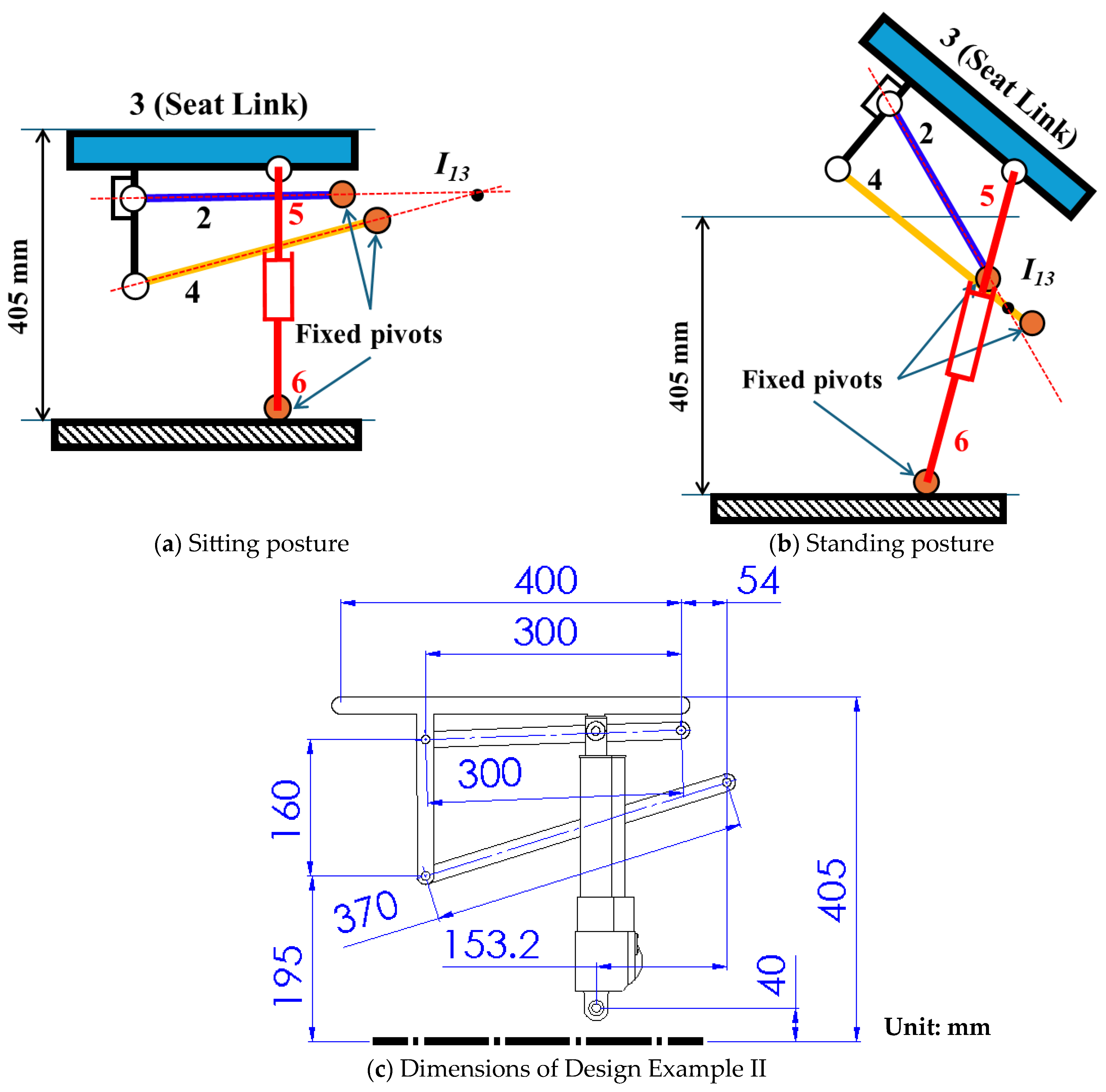 Figure 9 shows a heavy-duty power-assisted toilet seat lift assembly and its corresponding skeleton mechanism [6]. This toilet chair mechanism consists of six links and seven joints. The actuator directly drives the seat link (3) to move upward and rotate. After combining with the actuator, it becomes an eight-link and ten-joint mechanism (N = 8, J = 10), featuring nine revolute pairs and one sliding pair (J = 10). Based on the degrees of freedom formula, the mechanism has one degree of freedom, as shown in Equation (4). Figure 9 shows the instantaneous center positions for sitting and standing, indicating minimal variation in the distance between the knee joint and the instantaneous center in both positions. Therefore, it satisfies the kinematic requirements for the sit-to-stand movement. According to the analysis by the computer-aided engineering software INSPIRE, the rotation angle of the seat link (3) is only 26.38°. For a person weighing 150 kg (equivalent to 1500 N), the required actuator force is 1700 N, as shown in Figure 10. This design also has the following disadvantages: