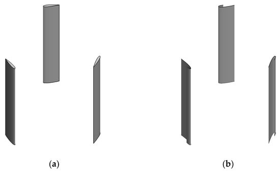 This paper uses simplified symmetrical blade VAWT and J-shaped VAWT as geometrical models, as shown in Figure 3. Since this paper primarily investigates the effect of airfoil shape on the performance of the VAWT, the effects of the shaft and the support arm are ignored. Both the symmetrical blade VAWT and the J-shaped VAWT are based on the NACA0015 airfoil design, with specific parameters shown in Table 1. In this paper, the symmetrical blade is referred to as the S-shaped blade, and the J-shaped blade is designed by eliminating one side of the S-shaped blade from the maximum thickness [], as shown in Figure 1.