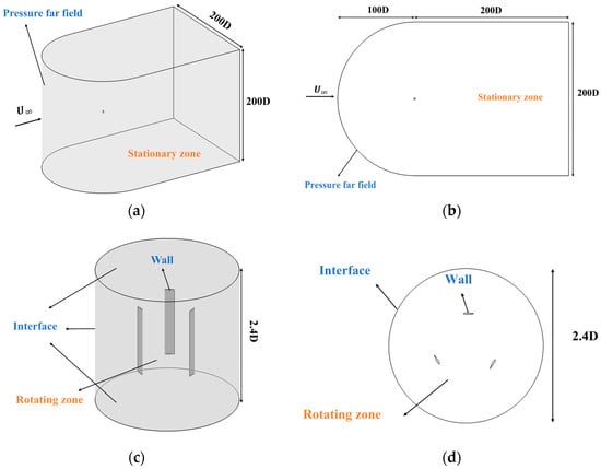 Computational domain: (a) 3D view of the stationary zone, (b) top view of the stationary zone, (c) 3D view of the rotating zone, and (d) top view of the rotating zone.