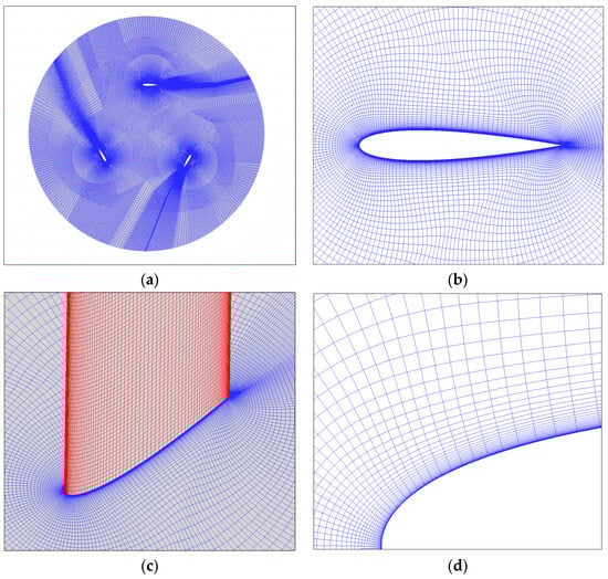 Rotating zone grid topology: (a) grids at the rotating zone, (b) grids around the blade, (c) grids near the blade (the blade grids is stained with red), (d) boundary layer grids.