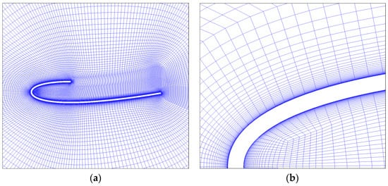 Figure 6a shows the mesh structure at the rotating zone, and it has a fully structured mesh with refinement in the wake region to capture the complex flow structure. Figure 6b shows the grids around the blade, with 240 × 200 grid nodes in circumferential and spanwise. To ensure accurate simulation of the boundary layer, the height of the first layer is m to meet the requirement of the SST-IDDES model, with a growth rate of 1.2. The mesh topology of the J-shaped blade is shown in Figure 7, with the same boundary layer setup as the S-shaped blade, and it has 340 × 200 grid nodes in circumference and spanwise. The S-shaped VAWT has 32,666,558 meshes, and the J-shaped VAWT has 34,184,216 meshes. The grid resolution employed in this study is deemed sufficient for conducting the IDDES simulations based on comparative evaluations with previous studies [,,]. Specifically, ref. [] investigated the VAWT wake using overlapping grids, and performed grid independence analysis with six sets of grids, the densest of which contained approximately 7 million cells. In contrast, the present study utilizes grids exceeding 30 million cells, providing a much finer resolution. Ref. [] adopted structured grids for VAWT wake simulations, achieving grid independence with their densest grid at 4.1 million cells, again considerably lower than the current study. Additionally, ref. [] carried out a detailed grid convergence study using the Grid Convergence Index (GCI) method, where grid sizes corresponding to chordwise element lengths of 6.5%, 2.5%, and 1.5% of the chord were analyzed. The corresponding grid size is 2.8 million, 16.9 million, and 55.1 million, respectively. Their results indicate convergence when the element size is 2.5% of the chord length. In the present study, the maximum chordwise element size was maintained below 2.5% of the chord length, satisfying the established convergence criteria. Therefore, based on mesh size, mesh resolution, and convergence criteria, the present grid configuration was confirmed to be sufficiently fine for accurate IDDES simulations of VAWTs.