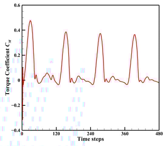 To rapidly diminish the influence of initial conditions, unsteady computations begin with the steady-state solution as the initial condition. The steady case is simulated using the SST-RANS model, whereas the SST-IDDES model is applied for the unsteady case. The unsteady time step interval corresponds to a rotor rotation of 3°, which has been validated as sufficient for simulating VAWT [,]. Each time step undergoes up to 500 iterations to ensure the residual is sufficiently small. Figure 8 shows the variation in the instantaneous torque coefficient of one S-shaped blade with a time step at TSR = 1.6. The peak torque coefficient values at the third and fourth revolutions are 0.3647 and 0.3623, respectively, resulting in a relative error of approximately 0.66%. This error falls within the acceptable threshold (less than 1%) based on the convergence criterion proposed in ref. []. Therefore, the data from the fourth revolution are utilized for the aerodynamic performance analysis in this study. All simulations use 960 partitions for MPI-parallel computing to speed up the calculation speed, which takes about 46 h to calculate four revolutions. The numerical setup for the current calculations is summarized in Table 2.
