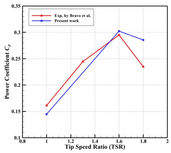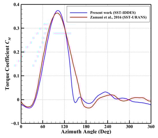 where and A are the rotor torque, rotational angular velocity, incoming flow density, incoming flow velocity, and swept area of the rotor, respectively. To validate the current numerical findings, computed power coefficient CP values were compared with experimental data from Bravo et al. [], as shown in Figure 9. It can be seen that the variation in Cp with TSR obtained by the current numerical method is in good agreement with the experimental values. However, when TSR = 1.8, the numerical results have a large error with the experimental values, which is due to the fact that the numerical simulation does not consider the friction and the aerodynamic loss of the strut []. Since the experiments only have data on average power coefficient and TSRs, Figure 10 shows the torque coefficient of a single blade rotating for one cycle at TSR = 1.6 and compares it with the results of Zamani et al. []. The results show better agreement between the two numerical simulations, but discrepancies remain between the maximum and minimum torque values. These differences primarily stem from Zamani et al. [] using the URANS model, while the current study employed the IDDES model.