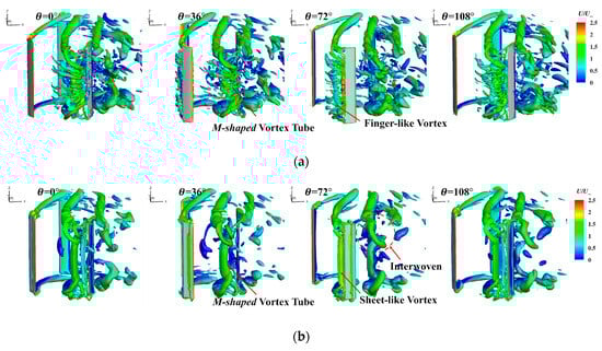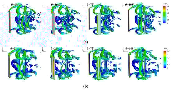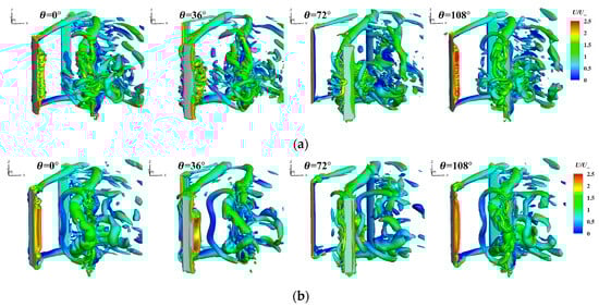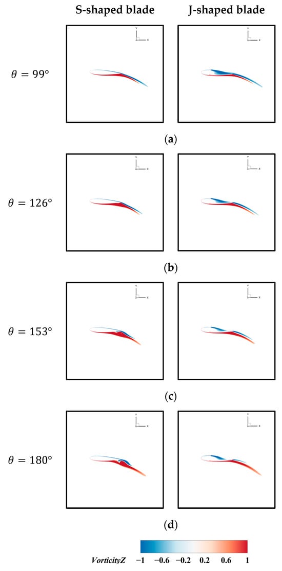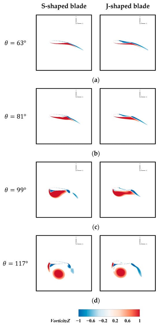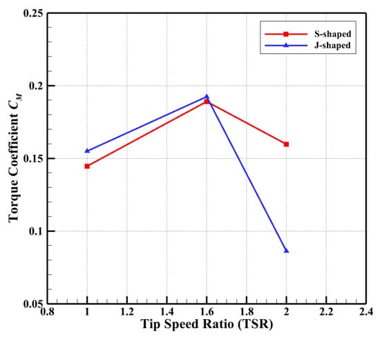 At a high TSR, the time-averaged torque coefficient CM of the J-shaped blade was considerably lower than that of the S-shaped blade. As shown in Figure 13c, at all azimuth angles, the CM of the J-shaped blade was lower than that of the S-shaped blade. In most leewind regions, the CM of the J-shaped blade experienced a smaller reduction than in other regions. This indicates that the J-shaped blade plays a positive role in this region, but not enough to counteract its negative effect. Consequently, the time-averaged torque coefficient of the J-shaped blade is significantly reduced.