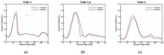 The variations in the torque coefficient versus azimuthal angle at different TSRs: (a) TSR = 1, (b) TSR = 1.6, (c) TSR = 2.