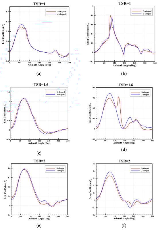 Figure 11 compares the time-averaged of the S-shaped and J-shaped VAWTs over one week of rotation at different TSRs. It can be observed that the of both types of VAWTs initially increased with TSR before peaking at TSR = 1.6, after which it decreased. Furthermore, the of the J-shaped VAWT was higher than that of the S-shaped VAWT at low (TSR = 1) and medium (TSR = 1.6) TSRs, but became lower at a high TSR (TSR = 2). To understand the underlying causes of these variations, this study will conduct a comprehensive analysis of the aerodynamic performance of the two VAWTs at different TSRs. Specifically, the investigation will focus on aerodynamic loads, pressure distributions, and flow field structures to provide deeper insights into the mechanisms influencing VAWT efficiency.
