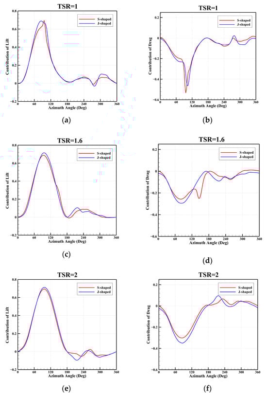 Variations in the contribution of lift and drag to the tangential force versus azimuthal angle at different TSRs: (a) lift at TSR = 1; (b) drag at TSR = 1; (c) lift at TSR = 1.6; (d) drag at TSR = 1.6; (e) lift at TSR = 2; (f) drag at TSR = 2.