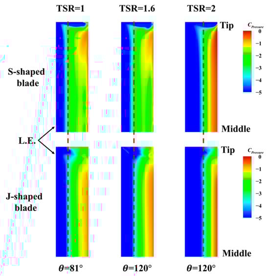The blade surface pressure distribution allowed for the visualization of the distribution of aerodynamic loads on the blade surface, as well as the reflection of the three-dimensional characteristics of the flow field along the spreading direction. To evaluate the impact of the J shape on the blade surface pressure distribution, this paper compares the suction surface pressure distribution (half mode) of two types of blades at the azimuthal angle where the J-shaped blade exhibits enhanced performance (i.e., the azimuthal angle where the lift is increased in comparison with that of the S-shaped blade), as illustrated in Figure 16. There was a notable disparity in the pressure distribution on the suction side between the two types of blades, with a more pronounced negative pressure zone at the leading edge of the J-shaped blades. This larger negative pressure zone on the suction side gives rise to a more substantial pressure differential between the pressure side and the suction side, which in turn leads to an augmentation in the lift coefficient.