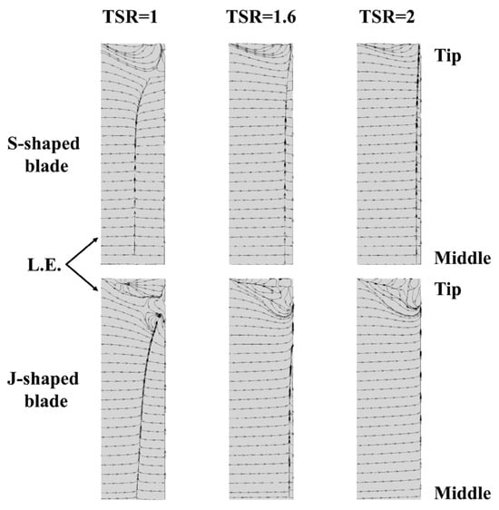 The surface friction lines of wind turbine blades have the capacity to reflect the flow structure on the blade surface. Figure 17 presents the comparison of the limiting streamlines at with different TSRs. The limiting streamline visualization reflects the local wall shear stress direction and is an effective method to identify flow separation, attachment lines, and critical points on the blade surface. It can be observed that a distinct negative bifurcation line is present on all six blades, defining this line as a separation line []. A horizontal comparison reveals that the separation line gets closer to the trailing edge as the TSR increases. This suggests that at the same azimuth angle, higher TSR results in weaker flow separation and less severe dynamic stall.
