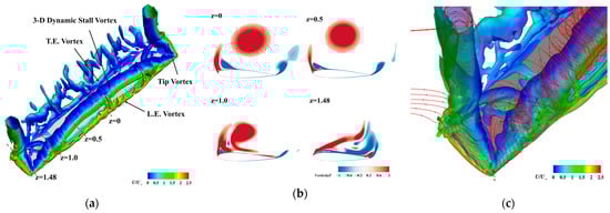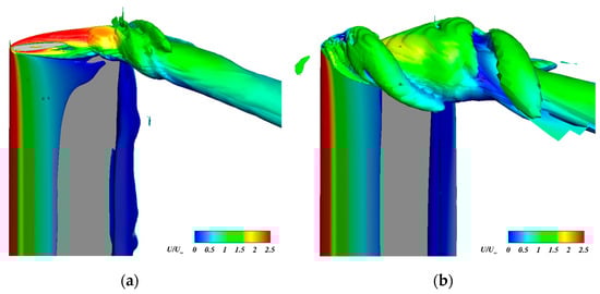 where r is the vortex core vector and R is the rotation strength around r. The vortex patterns presented in this paper are all the iso-surfaces of Rortex = 0.065, colored according to the corresponding dimensionless velocities . The dimensionless vorticity is defined as follows: