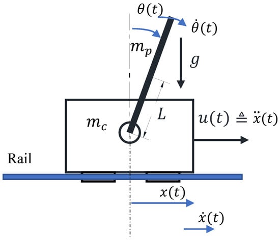 The CIP system consists of a cart moving along a rail, with a pendulum hinged to the cart, as shown in Figure 1. The displacement of the cart (m) is considered in the horizontal direction and its velocity is denoted as (m/s). The angle between the pendulum and the vertical up direction is considered as the pendulum angle (rad) and its angular velocity is (rad/s). The mass of the cart and of the pendulum are denoted by (kg) and (kg), respectively; L is the half-length of the pendulum (m); g is the gravitational constant (m/s2); and is the required acceleration parallel to the rail, applied to the cart (m/s2). The required acceleration of the motor is controlled by a pulse-width-modulation (PWM) signal from a stepper driver.