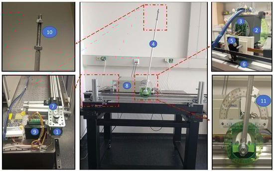 Experimental rig with CIP: ① stepper motor; ② cart; ③ rotary magnetic encoder module pendulum clamp; ④ pendulum; ⑤ miniature incremental magnetic encoder module; ⑥ magnetic scale; ⑦ belt; ⑧ dSPACE; ⑨ microstep driver; ⑩ nuts; ⑪ pendulum clamp.