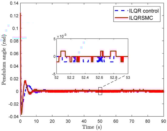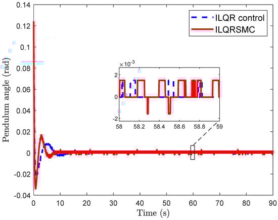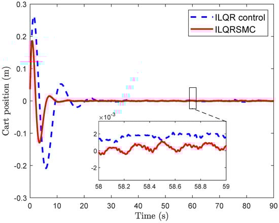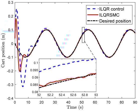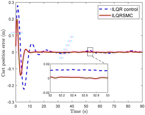 - In practice, achieving correct calibration of the pendulum angle at the equilibrium upright position is challenging, often leading to an offset of cart position errors [35]. Existing sliding mode controllers have not considered this problem, resulting in significant steady cart errors during implementation [36,37]. To solve this problem, we designed an augmented model of a CIP, comprising integral cart error. The proposed control is designed for this model, inheriting the merits of ILQR control and SMC control, while ensuring ease of parameter selection for practical engineer applications.
