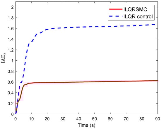 where T is the running time, and are the integrated absolute error of the cart position error and the pendulum angle error, respectively. Smaller IAE values signify better tracking performance, as they reflect less accumulation of tracking errors. In contrast, higher values of IAE imply a greater accumulation of tracking errors, thereby indicating a worse tracking capability. In this context, the proposed control exhibited an index of m for cart position, while this index for ILQR was m. The time change of IAEx is given in Figure 5, indicating the fast error convergence and small steady-state error of the proposed control. The proposed control achieved a slightly higher index value for pendulum angle at rad, which can be attributed to the transient response from 0–10s. To thoroughly evaluate the control performance of a CIP system, it is necessary to separately analyze the IAEx and values. By comparing the , values, which present the total accumulated errors in the cart position and pendulum angle over time, respectively, a detailed understanding about the dynamic behaviors of the cart motion and pendulum angle can be obtained. Furthermore, to evaluate the overall performance of the CIP for each controller, the total IAE index value is calculated by combining the and values. The total integrated absolute error of both the cart and pendulum angle error of the proposed control was , significantly lower than the recorded for the ILQR control, indicating the superior performance of the proposed control method. Although the proposed control provided good stabilization performance for the CIP, its control signal was higher than that of the ILQR controller, as shown in Figure 6. This can be explained by the structure of the SMC control law, which consists of a linear component and discontinuous component . The linear term stabilizes the nominal system, while the discontinuous term compensates for the matched lumped disturbance. By contrast, the low control signal of the ILQR may result in an inadequate control input for the CIP, reducing its ability to effectively counteract disturbances and uncertainties [51]. Although the control input plots demonstrate a qualitative comparison of these controllers, a comprehensive evaluation could be conducted by quantifying the control effort. One such quantitative measure is the integral absolute control (IAC) [52], which calculates the total absolute value of the control signal over time and is determined as follows: