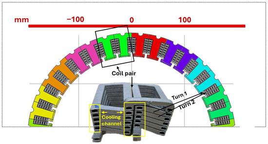 The test objects used in this study are motorettes (pair of coils for stator winding) under the ARPA E project ASCEND (Aviation-class Synergistically Cooled Electric-motors with Integrated Drives) looking for design and manufacturing of a 250 kW, 5000 rpm surface permanent magnet (SPM) synchronous machine integrated power electronics drive [9,10]. This machine is composed of 18 additively manufactured (AM) coil pairs, each integrated with heat pipes for improved thermal management, as shown in Figure 1. In the figure, a half-view of the stator structure is presented, displaying a coil pair with visible cooling channels. The section of the stator highlighted in a single color represents one coil pair. Considering modular nature of the machine design, each coil pair is directly connected to an H-bridge converter of the motor drive. The fundamental frequency used for this motor is 1250 Hz, while the switching frequency is 20 kHz. The design of motorette is being studied in the perspective of developing a high-power density motor for drive train of the aerospace propulsion system.