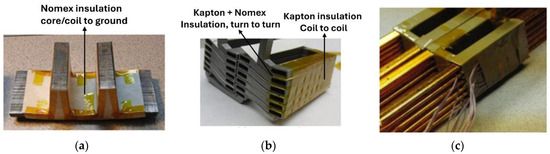 Figure 2 shows the components of the motorette. Figure 2a depicts the stator core having Nomex paper as coil-to-ground insulation. Coils, displayed in Figure 2b, consist of layers of solid and hollow conductors, where the hollow conductors manage motor cooling. The insulation between coils is obtained by wrapping PD-resistant Kapton (Kapton CR) around the hollow conductors, as highlighted in Figure 2b. Similarly, Nomex is used for turn-to-turn insulation. Two insulation technologies were considered in motor development, differing mainly in insulation thickness (Figure 3).