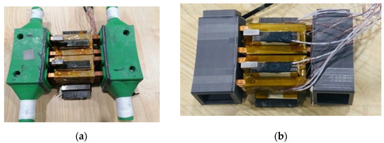 Prototypes of the motorettes (coil pairs) developed for the motor. (a) Motorette prototype with insulation technology 1; (b) motorette prototype with insulation technology 2.