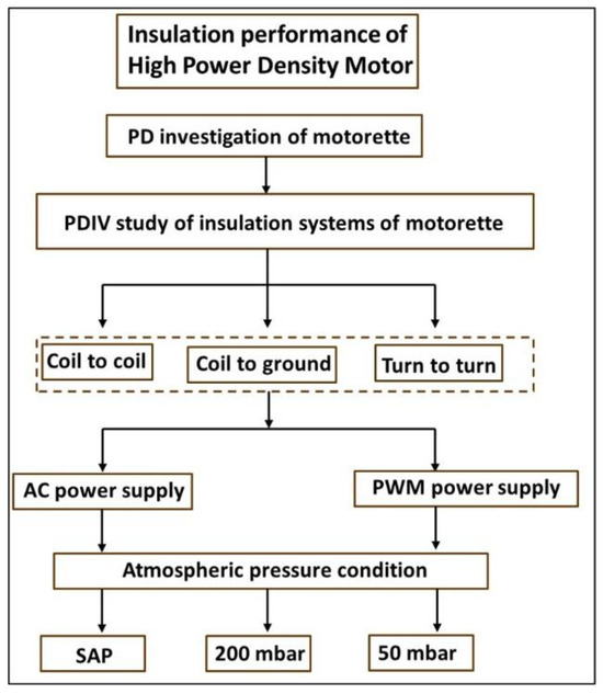 A global test scheme is illustrated in Figure 4, where the three insulation sub-systems characterized in terms of partial discharge inception voltage (PDIV) are highlighted. Notably, tests were performed at different pressures (since the design and manufactured motor prototype were meant for aircraft applications), but this paper focuses on the results obtained at standard atmospheric pressure (SAP).