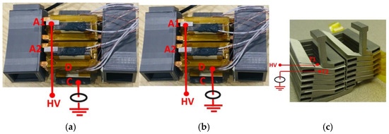 For the coil-to-ground PD study, HV is applied to one terminal of a coil, while the stator core is grounded, Figure 5a. In the coil-to-coil study, HV is applied to one terminal of the coil, and the ground is connected to the adjacent coil on the surface of the Kapton insulation, Figure 5b. As regards turn-to-turn insulations, the motorette prototype does not provide suitable connection points. Therefore, PD testing was conducted on an unfinished structure (prior to insulation wrapping), where HV is applied to the metallic part of a turn, and the ground is connected to the insulation between this turn and its adjacent one, as shown in Figure 5c.