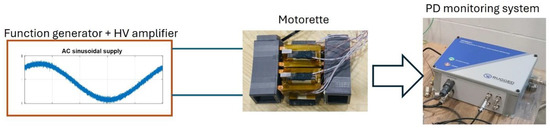 Figure 8a displays a photo of the experimental setup, while Figure 8b provides the electrical layout of the setup. The synchronization (AC reference) signal for PD measurement, needed to build the phase-resolved partial discharge (PRPD) pattern was taken from the HV amplifier. A high-frequency current transformer, (HFCT) connected to the ground connection, i.e., in series with the motorette, was used as PD measurement sensor.