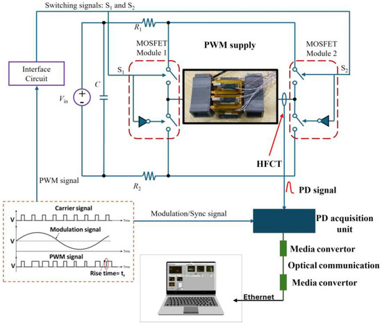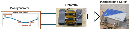 The schematic of the 2- and 3-level converters used in this work is shown in Figure 10. A generator produces two signals: a modulated AC (PWM) one and its fundamental component. The modulated signal is transmitted via optical fiber to a PWM generator, which is based on MOSFET half-bridge modules. The test object, i.e., the motorette, is connected in between the mid-point of each module, being supplied therefore by an inverter with 2-level and 3-level output capability. An HFCT is installed on the grounded wire of the test object to sense PD pulses. Both detected PD pulses signal and fundamental wave from the signal generator are acquired by PD detector/acquisition unit (Rugged Monitoring, 1415 Frank-Carrel, Suite 230, Quebec, QC-G1N 4N7, Canada).