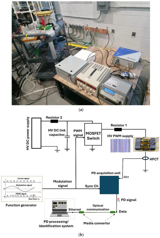 Experimental setup under PWM. (a) Photo; (b) electrical layout of the experimental setup.