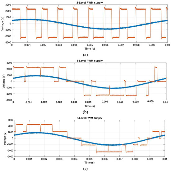 As can be seen, the PDIV varies based on PWM level configuration and slew rate (SR). In a 2-level PWM system, a higher slew rate (9.8 kV/μs) results in a lower PDIV (3.7 kV), while a lower slew rate (0.059 kV/μs) determines an increase in PDIV to 4 kV. This indicates that higher slew rates impose greater electrical stress, lowering partial discharge inception voltage. The PDIV increases with the number of PWM levels, reaching 4.15 kV with 3-level PWM (slew rate of 0.057 kV/μs) and 4.3 kV with the 5-level PWM (slew rate 0.056 kV/μs).