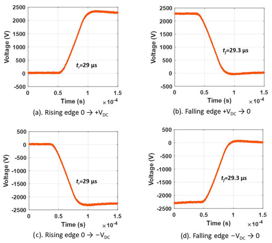 PWM voltage waveforms at rise and fall time (referring to 3-level PWM supply in Figure 11). (a) Rising edge 0 → +VDC; (b) falling edge +VDC → 0; (c) rising edge 0 → −VDC; (d) falling edge −VDC → 0.