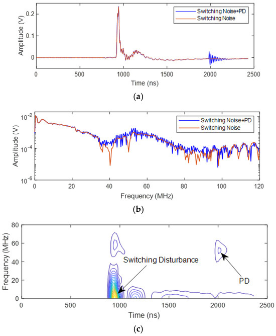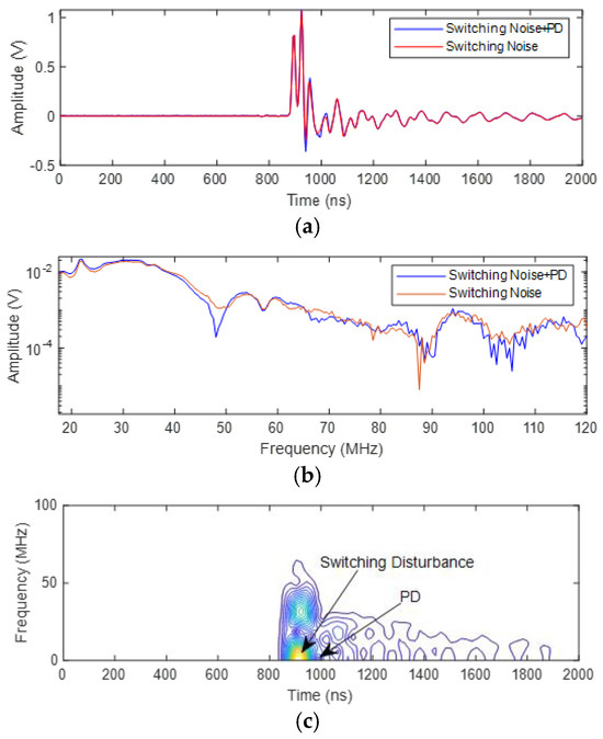 PD acquisition under repetitive impulsive voltages of 400 ns risetime, 1.7 kV peak: (a) Measured time-domain signal with PD superimposed to switching disturbance; (b) short-time Fourier Transform of measured signal (PD and noise band overlap); (c) short-time Fourier Transform with the time-frequency plane representation of the signal.