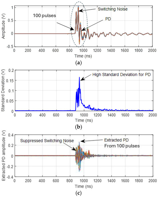 Example of time domain filtering; (a) series of acquisition traces (100 signals/pulses) containing overwhelming noise and PD pulse; (b) standard deviation test; (c) PD and residual noise extracted from (a).