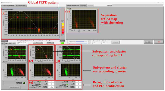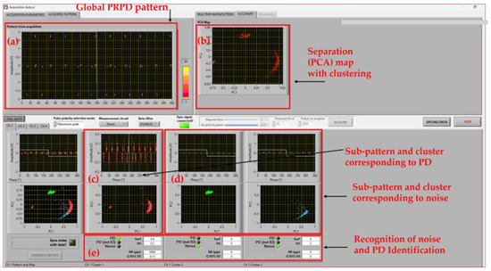 Example of software screenshot for PD test on coil to ground (A1-C), motorette insulation technology 2, at 1.1PDIV and at SAP (AC sinusoidal waveforms, 60 Hz) with: (a) global PRPD pattern; (b) separation (PCA) map with clustering; (c) sub-pattern and cluster corresponding to PD; (d) sub-pattern and cluster corresponding to noise; (e) recognition of noise and PD Identification of the type of PD with likelihood of 100% surface, and 0% internal.