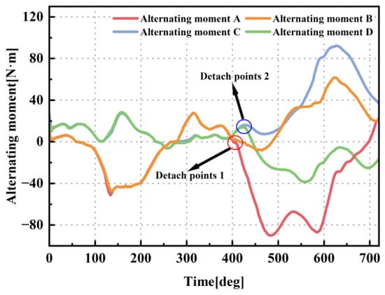 - The intermediate gears are more susceptible to being influenced by counteracting asymmetric torques from adjacent gears, which implies that middle gears are relatively predisposed to developing double-tooth contact and potential failure. The presence of dangerous double-tooth contact regions at 0.115 s, 0.137 s, 0.165 s, and 0.188 s suggests that the failure of the gear transmission system is causally linked to the occurrence of periodic internal impact loads between the gears. The occurrence of internal impact loads is attributed to the delayed transmission effects of alternating loads in the intermediate gears.